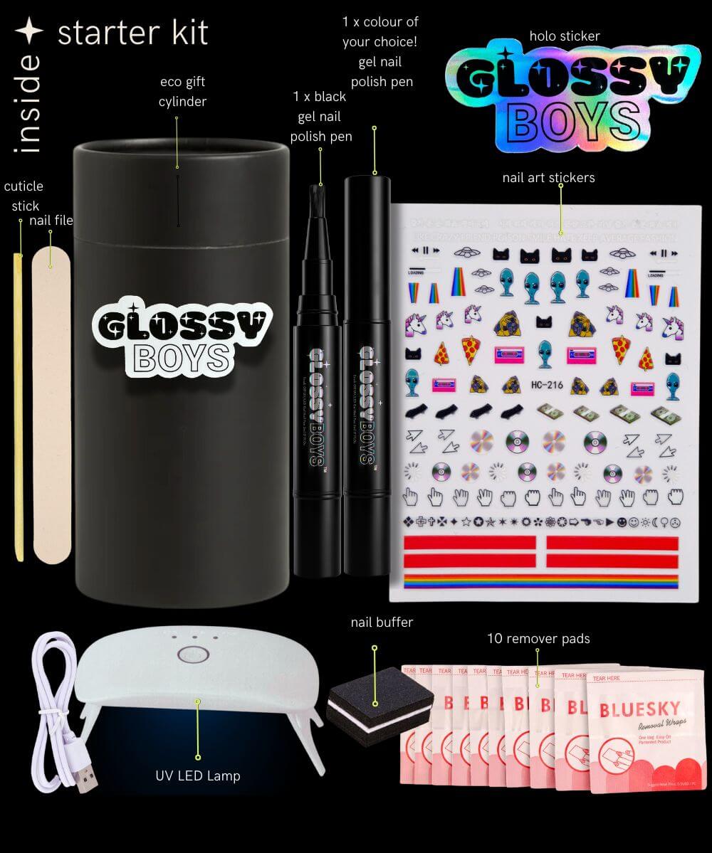 “The pens are super easy to use, the colours are awesome, bright, and fun. The lamps are perfect for curing, and the whole pack is easily stored in the Glossy boys tube packaging it came in the post with.”
